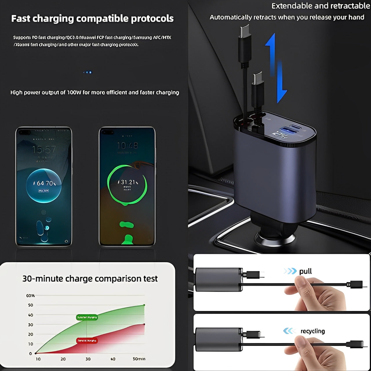 🔗 No more cable clutter! Our charger has a flexible and scalable design that pulls the cables within 80cm. 🧹 It automatically retracts for internal storage keeping your car clean and tidy. 🚮